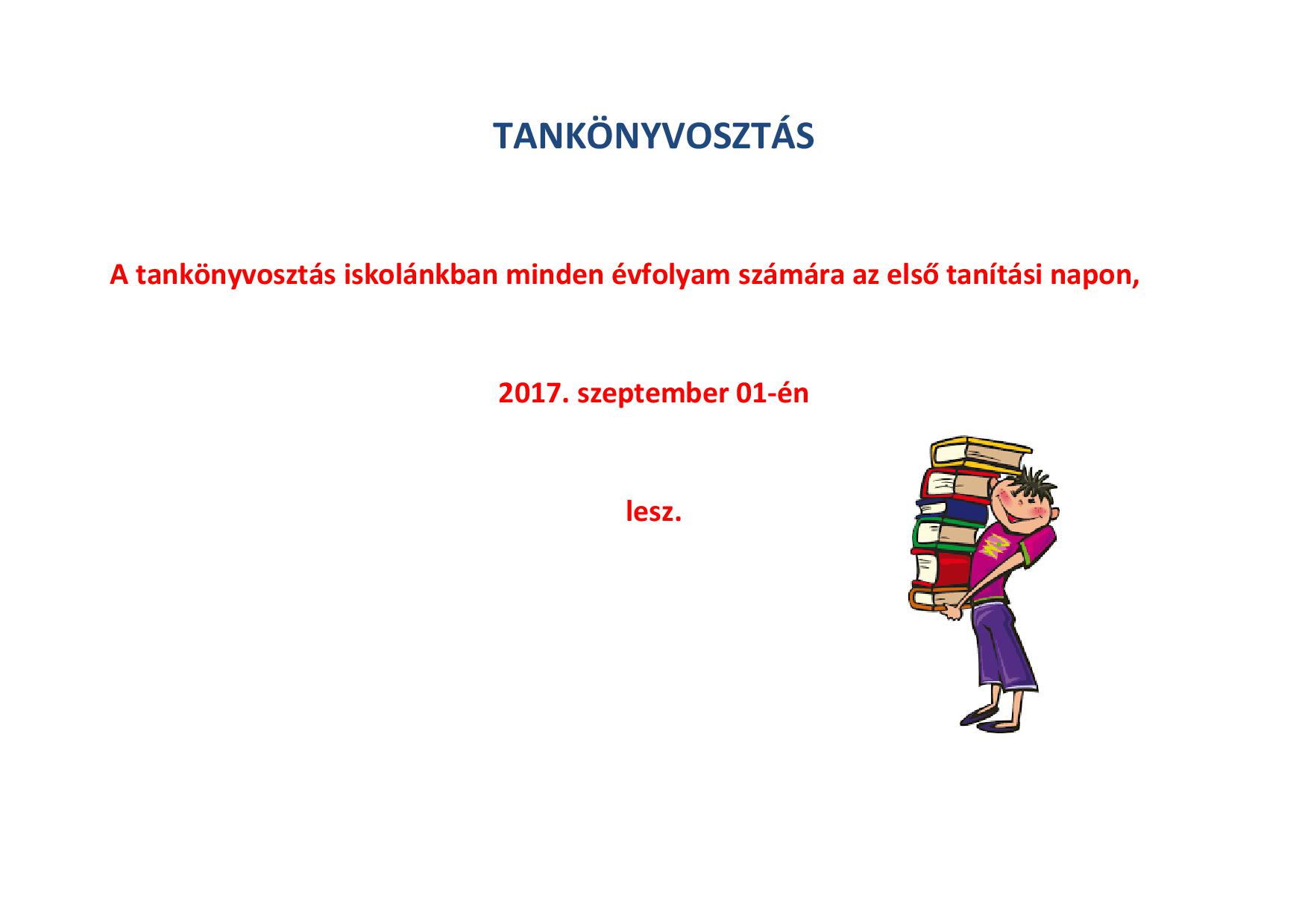 A fizetős diákok és a 9. évfolyam részére szeptember 1-én (pénteken), az első tanítási napon lesz iskolánkban a tankönyvosztás.